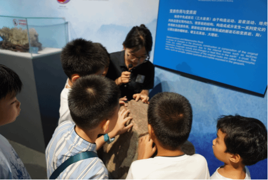据悉,天柱山博物馆以地质科普为特色,馆内陈列着丰富的岩石标本、地质演化模型,生动展现了天柱山地区独特的地质风貌。活动现场,孩子们围聚在讲解员身旁,目光聚焦于巨大的岩石标本,认真聆听关于地壳变动、地质作用的知识讲解。从岩石的形成到山脉的崛起,讲解员用通俗易懂的语言,将复杂的地质原理转化为趣味故事。孩子们好奇地触摸岩石,感受亿万年前地质运动留下的“痕迹”。