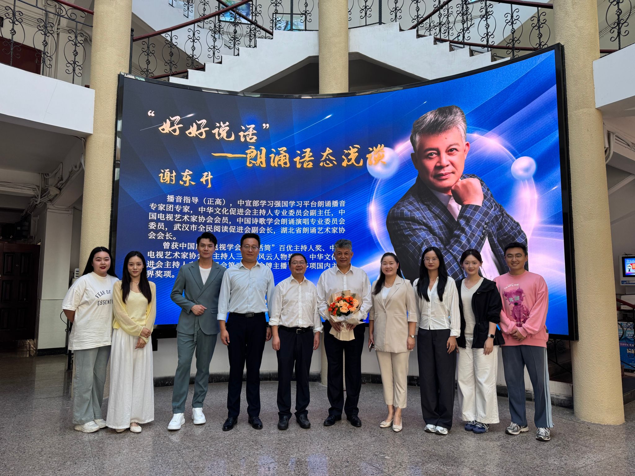 为提升播音主持专业学生的语言表达艺术与朗诵能力,9月22日下午,播音指导、中宣部学习强国学习平台朗诵播音专家团专家、湖北省朗诵艺术家协会会长谢东升走进影视传媒学院310小剧场,以“好好说话——朗诵语态浅谈”为主题,为师生带来“升声不息”朗诵系列专题讲座。此次讲座由影视传媒学院播音系系主任唐海主持,影视传媒学院彭涛院长、李曼书记、王磊院长、常双双院长、播音系牛世斌教授、车云鹤副教授等全体系部教师出席,播音与主持艺术专业2024级、2025级全体同学参加讲座。