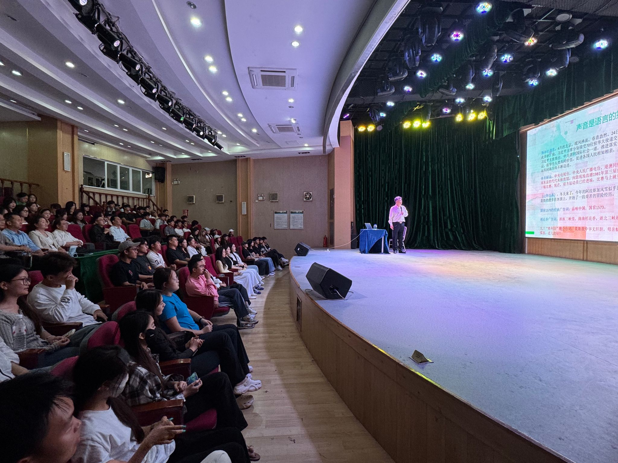 讲座伊始,谢会长从“好好说话”的重要性切入,结合自身在广电行业的丰富经历,系统梳理了不同年代的播音风格演变,并现场进行播音示范。他围绕多种类型的播音稿件,详细讲解了其处理方式与表达技巧,涵盖新华社新闻稿、体育赛事解说、动物世界配音、广告语以及舞台剧台词等不同体裁。