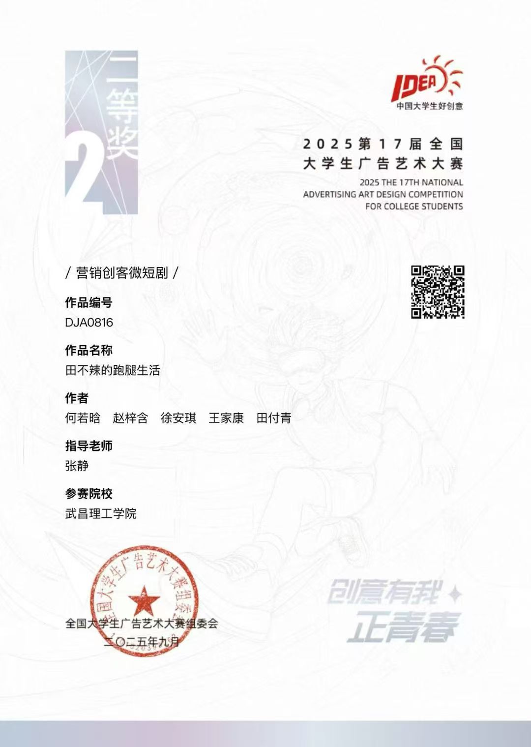 9月26日消息(通讯员 杨怡 报道)近日,2025第17届全国大学生广告艺术大赛国家级奖项重磅揭晓。武昌理工学院影视传媒学院学子何若晗、赵梓含、徐安琪、王家康、田付青团队凭借作品《田不辣的跑腿生活》,在全国众多参赛作品中崭露头角,荣获营销创客类微短剧国家级二等奖,以卓越创意与实践能力为学校赢得殊荣,充分彰显了学院在影视创作人才培养与实践教学领域的突出成果。