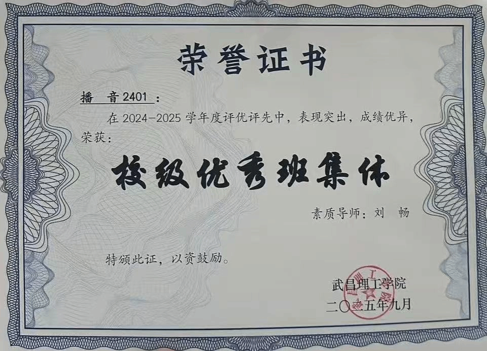 播音2401班是武昌理工学院影视传媒学院的优秀班集体,由36名心怀热爱的学子组成,其中14名入党积极分子充分发挥先锋模范作用,形成了一个兼具专业实力与集体温度的班集体。自2024年组建以来,班级秉承“追求卓越,走向成功”的校训,在专业学习、社会实践、校园活动等多个领域屡创佳绩,用声音传递力量,用团结书写青春华章,成功获评“校级优秀班集体”荣誉称号。