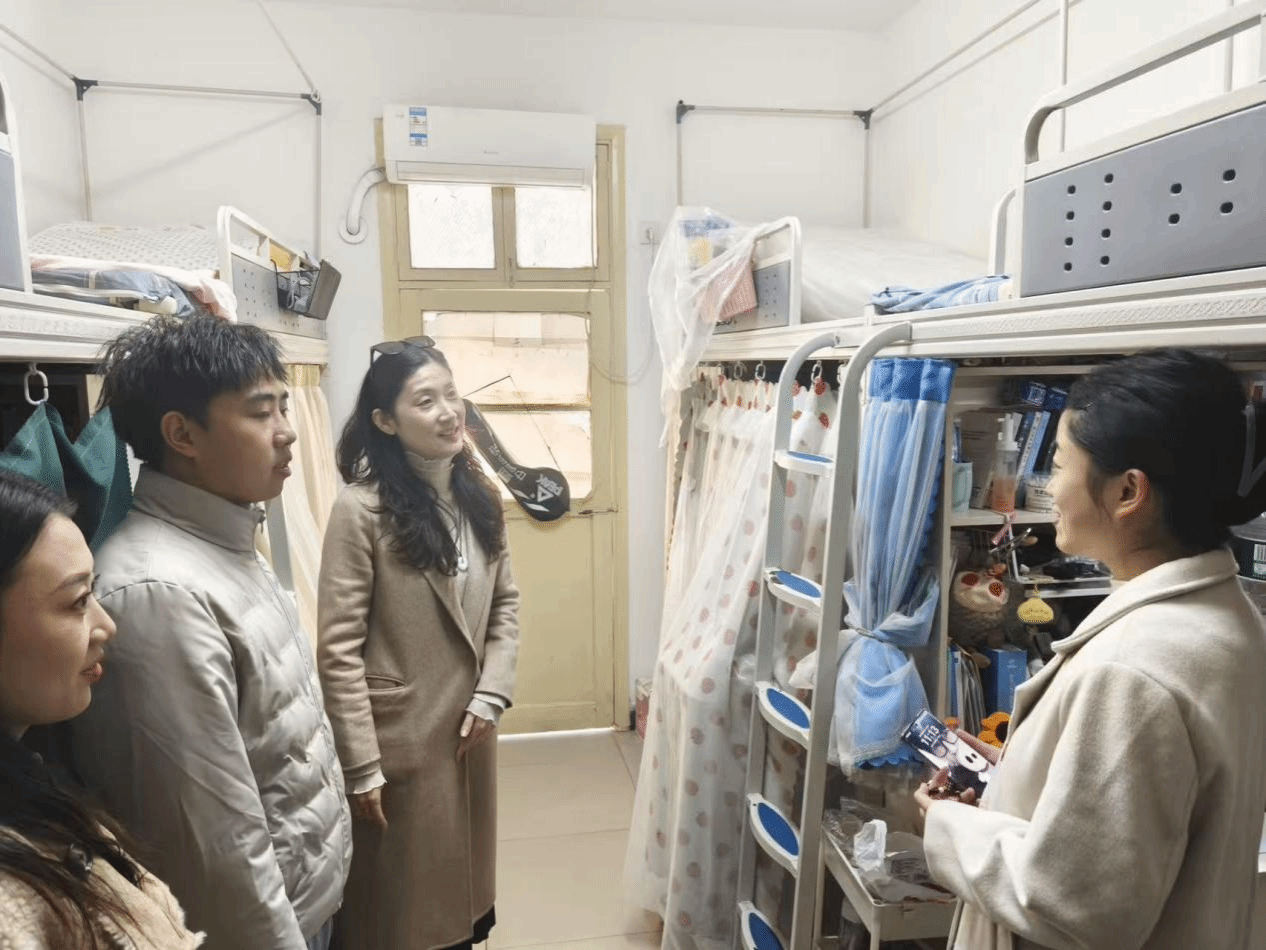 据悉,本次领导下沉宿舍慰问活动是影视传媒学院“暖冬关怀计划”的重要组成部分。走访过程中,学院领导与同学们进行了亲切交流,详细询问了同学们的学习进展、期末备考情况、冬季御寒物资是否充足,以及宿舍供暖、用电安全、热水供应等生活设施状况。在广播电视编导2301班学生宿舍,李曼书记关切地提醒同学们要注意天气变化,及时添衣保暖,合理安排复习时间,并特别强调了宿舍安全用电的重要性,叮嘱大家严禁使用违规电器,共同维护安全稳定的宿舍环境。张婧院长则结合专业学习,与同学们交流了期末作品创作与复习方法,鼓励大家克服困难,积极备考。