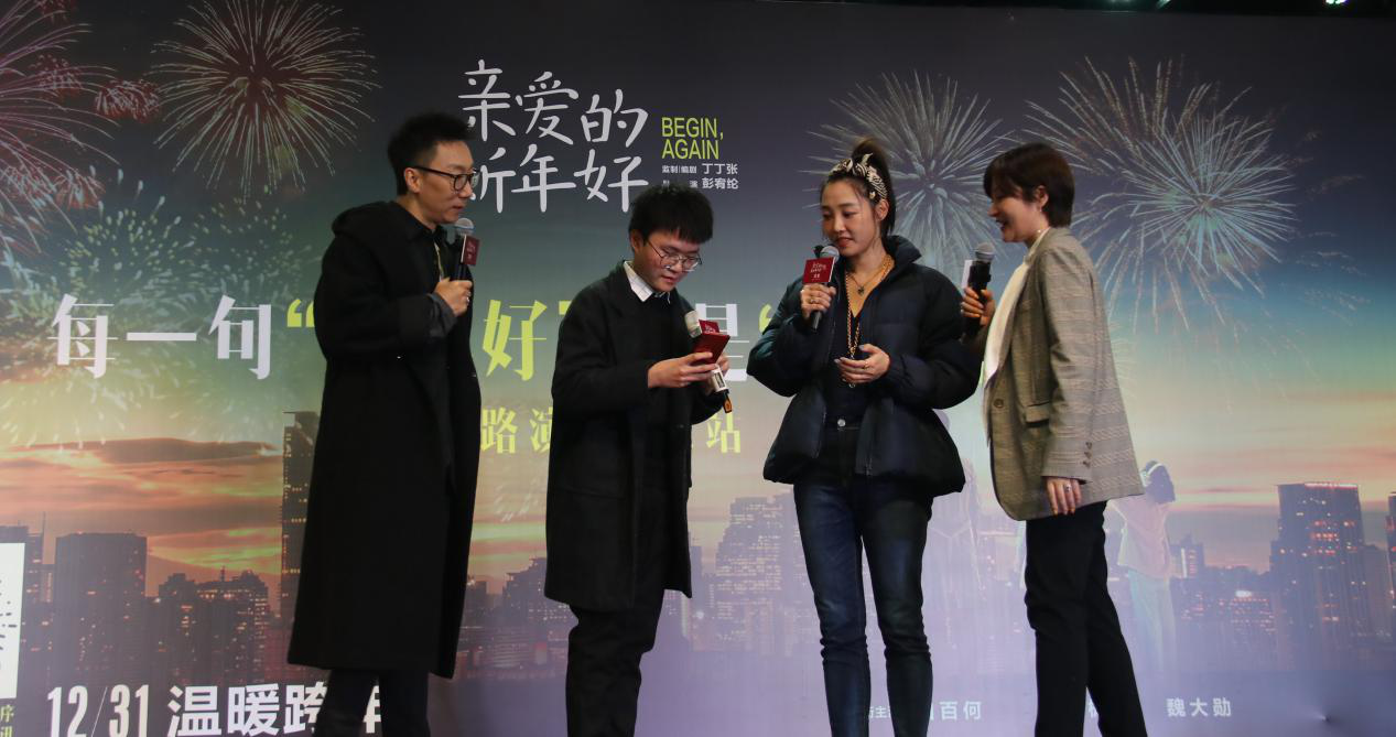 亲切的声音,熟悉的模样,在现场学生的热情呼声下,白百合引发了全场热潮!!简单介绍完影片的创作背景后,进行现场互动环节:说出想对谁说声“新年好”。全场有几位幸运学生得以与白百合等几位主创进行互动。“影片名叫《亲爱的,新年好》,但其英文翻译却是‘begin,again’?”丁丁张回答道:“在影片结束时候会感觉又是一个新的故事的开始,小白回到了北京,重新开始自己的生活。”另一位则表示自己毕业后,也会如影片中的小白那样去北上广打拼,还谈到自己在看《滚蛋吧,肿瘤君》时喜欢白百合,因为自己和影片中的她有着相似的经历,感触颇深,感谢白百合在那段时间成为自己的心灵支撑。