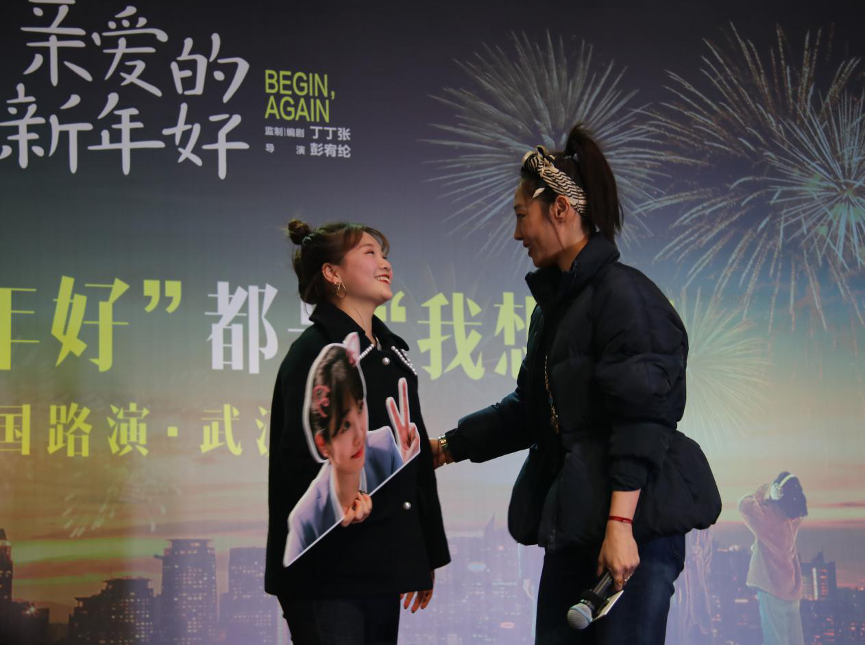 据悉,下午3时整,武昌理工学院大学生活动中心门口便已人山人海静候主创团队。4时整,进行前期宣传,例如微博参与讨论话题,猫眼电影点击“想看”等。4时20分,进行《亲爱的,新年好》武汉站路演放映,武昌理工学院学子一饱眼福,在一声声“新年好”中表达对未来、对亲人的祈愿。6时整,白百合、丁丁张等来到武昌理工学院现场,与现场观众进行互动。